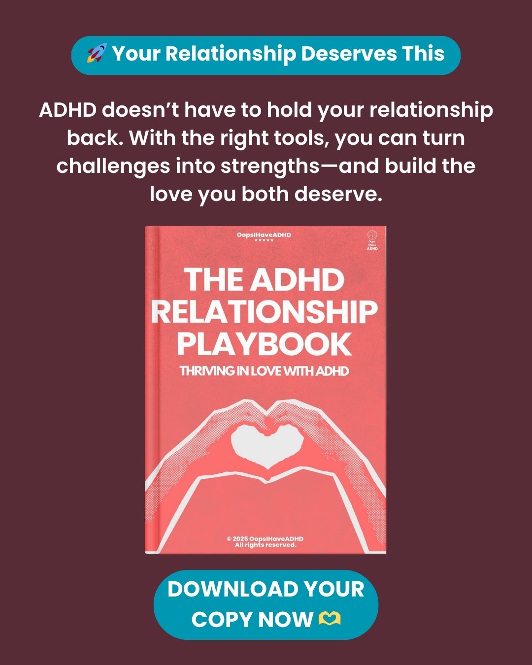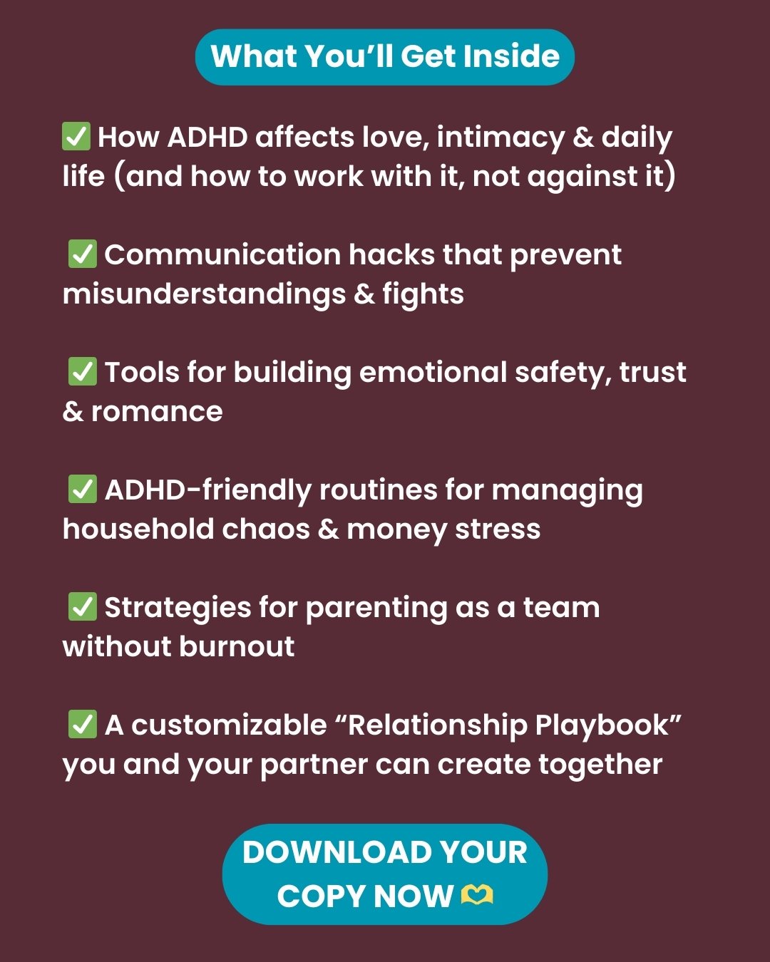 The ADHD Relationship Playbook is designed to help couples not just survive ADHD in love, but truly thrive together. 💡 Inside, you’ll find practical tools for better communication, managing daily challenges like household chaos and money stress, and keeping intimacy alive despite distractions. ❤️ With ADHD-friendly hacks, routines, and love rituals, this guide shows you how to turn struggles into strengths. Whether you’re dating, married, or parenting, this playbook helps you build trust, connection, and a relationship that lasts.